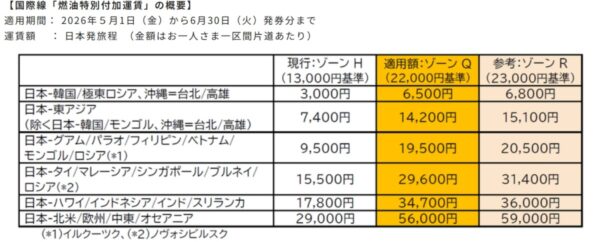 燃油サーチャージが値上げとなっておりますのでご注意ください。