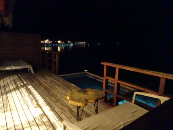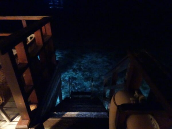 海へ直接降りる階段と、海上へせり出したハンモックが付いた水上ヴィラ