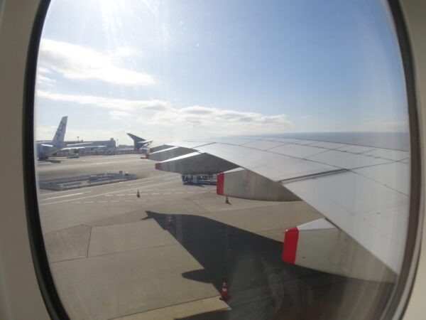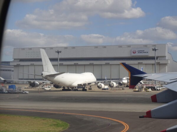 誘導路へと向かい中、大きな翼では動作確認を実施