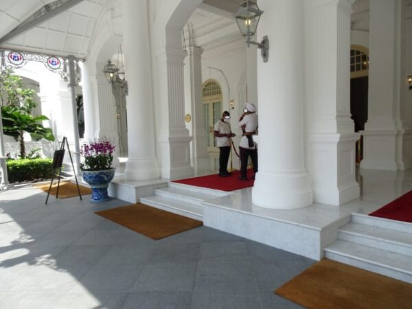 そうそう、ラッフルズホテルのドアマンですよね こちらで事前予約したスマホの画面を見せると まだ時間があるので 中庭とか見て時間になったら来てね っていう感じでしたので