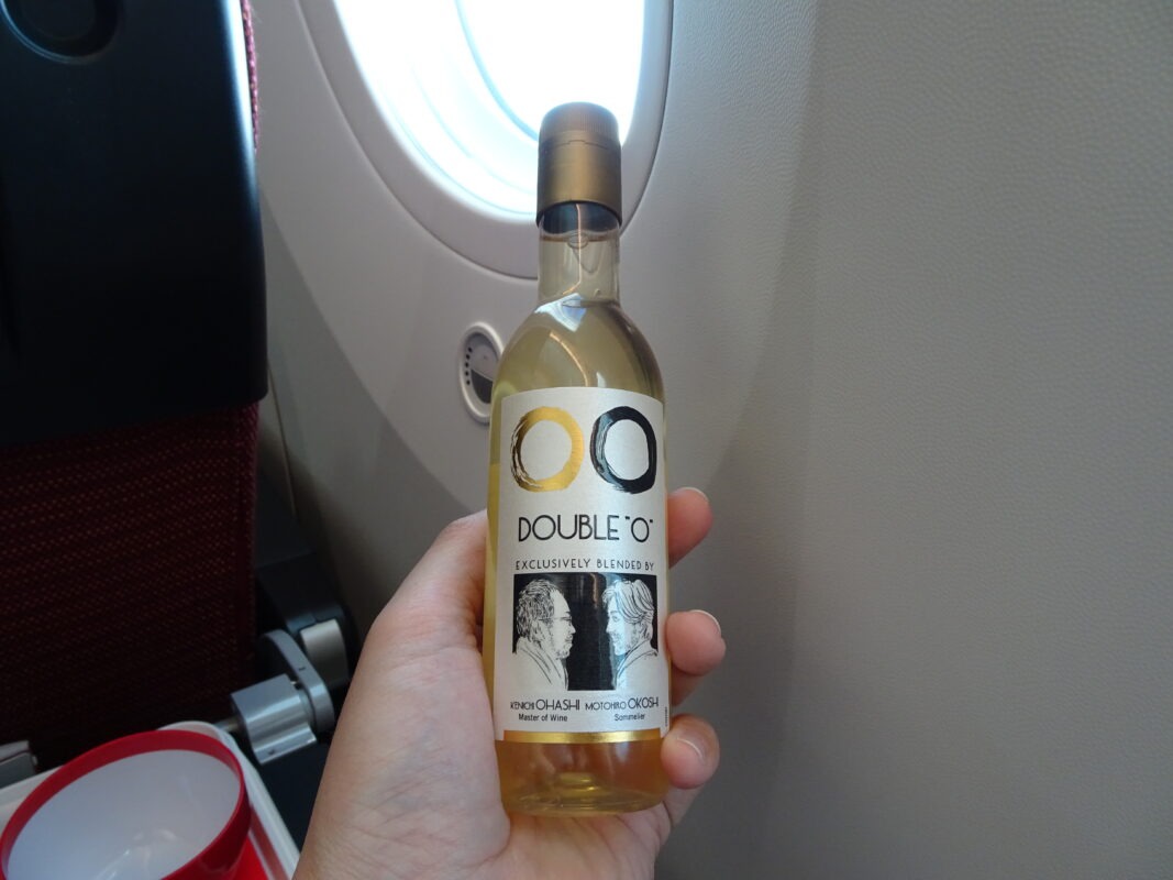 提供は リサイクル可能な軽量瓶(750ml)より CAさんがコップに注いで提供 となりました。今回 採用となりました 軽量ガラスボトル(ライトウェイトボトル)は、通常のワインボトルと同等の強度を保ち、大幅な軽量化を実現したガラス瓶 なんだそうで 通常のワインボトルの約半分となる300gほど ということで 環境負荷への貢献に重きをおいたものとなっています。