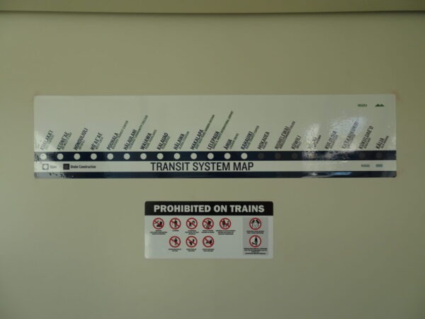 10時半すぎに乗車しましたが カポレイ方面は… うんガラガラ いくら空港に直結したといえども 肝心なワイキキ方面はまだまだですからね。主に道路渋滞緩和を目的としたところなので、朝時間帯は… おそらく混むのかなと思います。ちなみに、スカイライン開通に伴いまして スーツケースなどの持込規制も緩和になっています(The Bus同様) 今まで機内持込サイズだけだったのが その一回り大きなのもOK になったのかな ただし、周りへの配慮は必要ですけどね