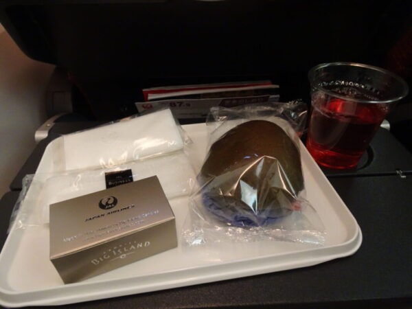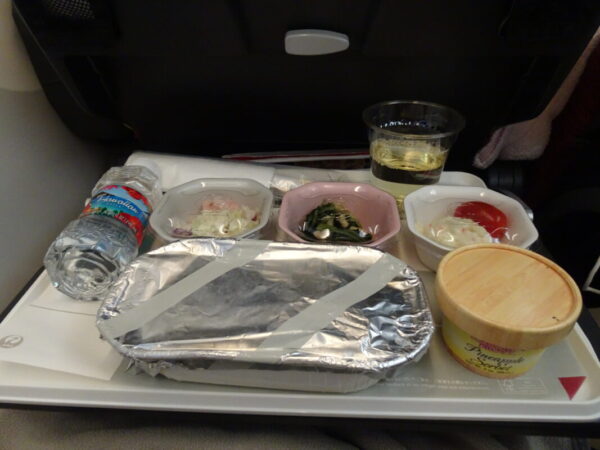 こんな感じですね。ワインはカップでの提供(ボトル提供廃止) シンプルになり過ぎてますが、タヌキ猫的には JALの翼という安心感 ですかね