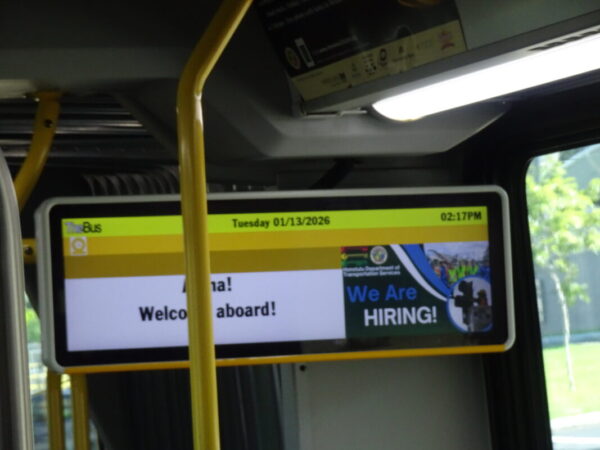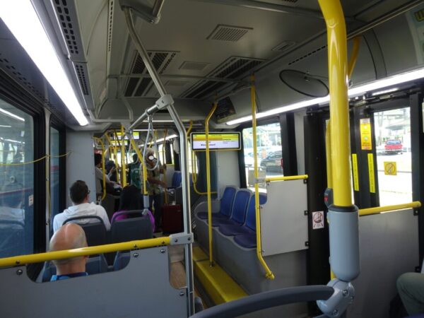 連結バス となっていますので 出来たら 奥の座席の方がいいかも。注意点としては 荷物を置く棚は無い ということですね。また車内 エアコン バカみたいに効かせていますので、羽織るもの 帽子なんかあってもいいよね。結構 個人的には ハワイの洗礼は 予想以上に寒い室内 ってやつでしょうか(笑) 降車合図はボタンもあれば、大奥御鈴廊下のようなヒモもございます(笑)