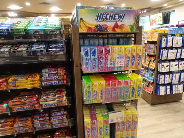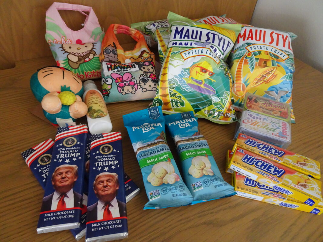 左上より キティエコバック 2つで 26$ / スナック オニオン 2つで 6$ / スナック ガーリック 2つで 6$ / Mint Tins 4個パック 14.99$ / HI-CHEW 2つで 4$×2 / マウナロア マカデミアナッツ 2つで 6$ / トランプバー 2つで 5$×2 / ソープローション 6.49$ / ドラえもん 19.99$