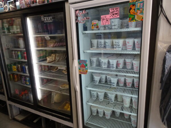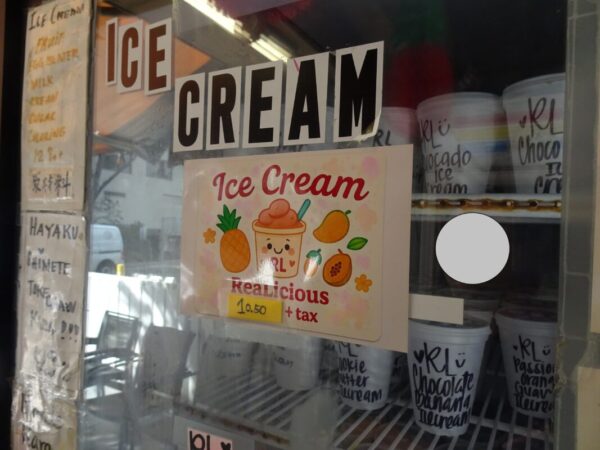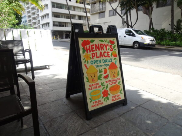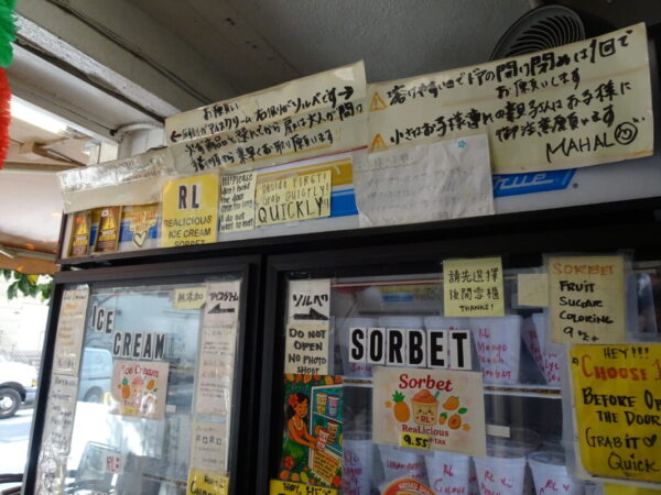 初めてハワイ から その名を知っていた 高橋果実店 ですが、今回初めて立ち寄ることができました♪ 事前情報で キャッシュオンリー であること 冷凍ケースは開けたら すぐに閉めること っていうのは聞いてきたので、どんな感じなのかも含めて買い物したいと思います。店舗前には ちょっとした飲食スペースもあるので 助かりますよねぇ♪