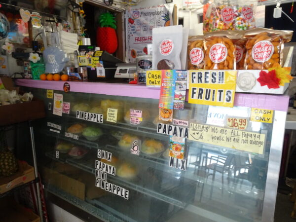 レジ下ショーケース内には フレッシュフルーツの販売もありました。 レジのところにも キャッシュオンリーの表記ありますね なかなか ハワイでチップ以外で現金を使う機会もほぼ無くなっているので 現金のみ というのは注意が必要ですね