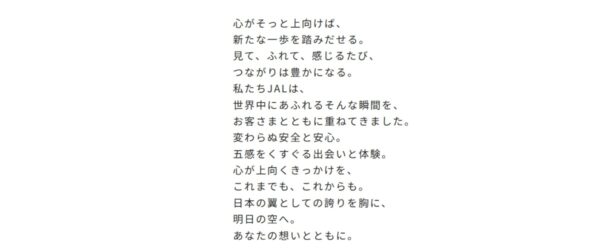 Soaring Together お客さまの心をそっと上向きに、サステナブルでウェルビーイングな未来へともに歩む …これ聞いて なんか響く? JALに乗りたいなぁ~って感じます? 広告代理店は誰が付いてるん? 電通か? ってここまでシラケちゃうのよ。