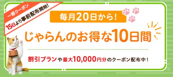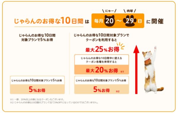 毎月20日〜29日(月末にかけての10日間)一律5%以上OFF: 対象プランが通常価格より5%以上安く設定されます 最大10%還元: ポイント10%以上還元保証プランが登場します