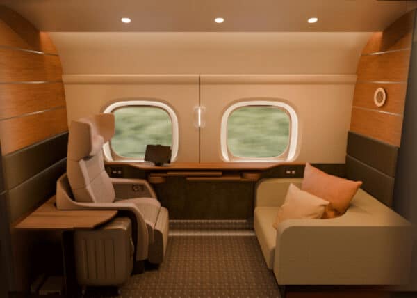 N700S 車輛の一部に 個室タイプ座席を 10月 半個室タイプ座席を 2027年度導入を目指すとしています。個室タイプには専用Wi-Fi、レッグレスト付きのリクライニングシート、個別調整可能な照明や空調、放送などの設備・機能を整備するとしています。